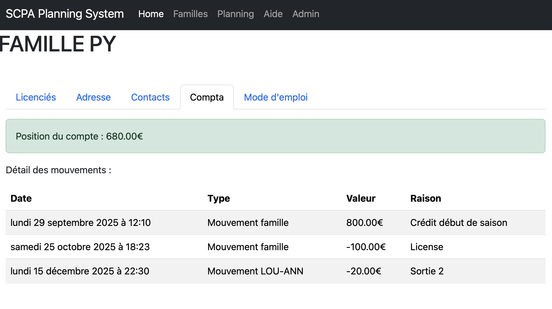 Chaque virement fait sur le compte du club pour alimenter un compte famille doit utiliser comme référence "Virement compte famille DUPONT"