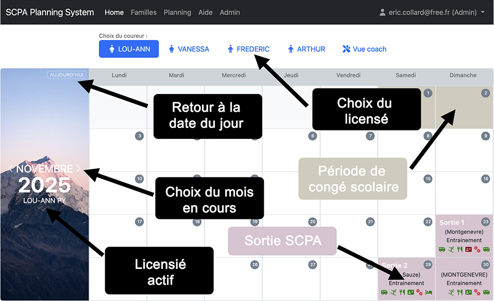 L'écran principal du planning vous permet de naviguer au sein du calendrier, et de revenir directement au mois en cours. Vous y trouverez les périodes de vacances scolaires (en beige), et les dates de sorties / stages prévues par le club (en rose)