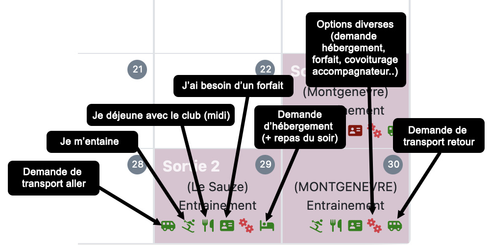 Pour chaque journée d'entrainement / course prévue avec le club, vous trouverez un certains nombres d'icônes représentant les différentes options que vous pouvez choisir. Chaque option est en rouge si vous ne l'avez pas sélectionné, et passe en vert si vous la sélectionnez. Pour l'activer, il suffit de cliquer dessus.